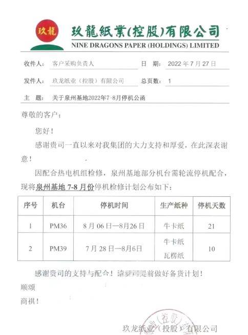 泉州玖龍 泉州玖龍的單臺(tái)紙機(jī)停機(jī)時(shí)間較長(zhǎng),其中生產(chǎn)牛卡紙的PM36將在8月6日-8月26日停機(jī)21天,生產(chǎn)牛卡和瓦楞的PM39從7月28日起停機(jī),時(shí)長(zhǎng)為10天。