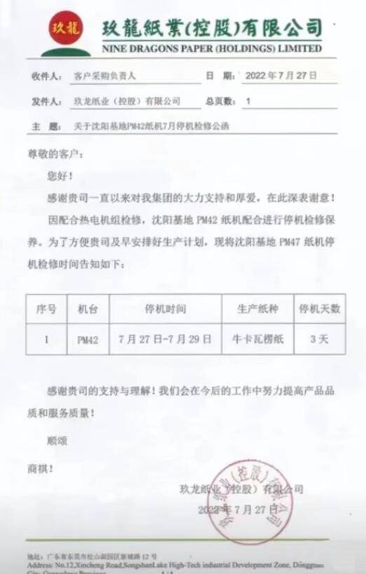沈陽(yáng)玖龍 沈陽(yáng)玖龍目前共有2臺(tái)紙機(jī),總計(jì)年產(chǎn)能為95萬(wàn)噸,本次停機(jī)的是生產(chǎn)牛卡和瓦楞紙的PM42,從7月27日起停機(jī)3天。