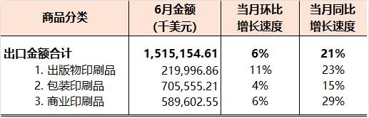 2022年6月國內(nèi)印刷品出口15.15億美元(參見表3),環(huán)比增長6%、同比增長21%。其中,出版物印刷品出口2.20億美元(環(huán)比增長11%、同比增長23%)、包裝印刷品出口7.06億美元(環(huán)比增長4%、同比增長15%)、商業(yè)印刷品出口5.90億美元(環(huán)比增長6%、同比增長29%)。 表3 2022年6月國內(nèi)印刷品出口統(tǒng)計(jì)