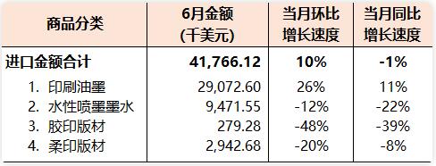 印刷器材 2022年6月國內(nèi)印刷器材進(jìn)口4176.61萬美元(參見表6),環(huán)比增長10%、同比下降1%。其中,印刷油墨進(jìn)口2907.26萬美元(環(huán)比增長26%、同比增長11%)、水性噴墨墨水進(jìn)口947.16萬美元(環(huán)比下降12%、同比下降22%)、膠印版材進(jìn)口27.93萬美元(環(huán)比下降48%、同比下降39%)、柔印版材進(jìn)口294.27萬美元(環(huán)比下降20%、同比下降8%)。 表6 2022年6月國內(nèi)印刷器材進(jìn)口統(tǒng)計(jì)