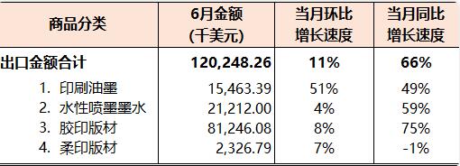 2022年6月國內(nèi)印刷器材出口1.20億美元(參見表7),環(huán)比增長11%、同比增長66%。其中,印刷油墨出口1546.34萬美元(環(huán)比增長51%、同比增長49%)、水性噴墨墨水出口2121.20萬美元(環(huán)比增長4%、同比增長59%)、膠印版材出口8124.61萬美元(環(huán)比增長8%、同比增長75%)、柔印版材出口232.68萬美元(環(huán)比增長7%、同比下降1%)。 表7 2022年6月國內(nèi)印刷器材出口統(tǒng)計(jì)