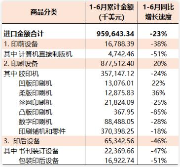 同期,相關(guān)印刷品主要品種出口,字典書籍類印刷品6.05億美元(同比增長24%)、期刊雜志類印刷品267.30萬美元(同比下降35%)、兒童圖畫書類印刷品3.82億美元(同比增長20%)、瓦楞紙盒(箱)9.43億美元(同比增長8%)、非瓦楞紙折疊紙盒10.78億美元(同比增長13%)、紙袋9.35億美元(同比增長36%)、辦公類印刷品17.40億美元(同比增長30%)、票證類印刷品3412.63萬美元(同比下降47%)、其他商業(yè)印刷品11.01億美元(同比增長15%)。 2022年1-6月國內(nèi)印刷品進(jìn)出口貿(mào)易順差62.25億美元(同比增長24%)。 印刷裝備 2022年1-6月國內(nèi)印刷裝備進(jìn)口9.60億美元(參見表10),與去年同期相比下降23%。其中,印前設(shè)備進(jìn)口1678.84萬美元(同比下降38%)、印刷設(shè)備進(jìn)口8.78億美元(同比下降20%)、印后設(shè)備進(jìn)口6534.26萬美元(同比下降46%)。 表10 2022年1-6月國內(nèi)印刷裝備進(jìn)口統(tǒng)計(jì)