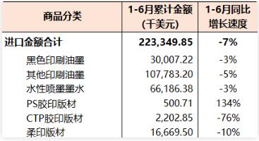 相關(guān)設(shè)備主要品種出口,計(jì)算機(jī)直接制版機(jī)2052.07萬美元(同比增長0%)、膠印機(jī)6739.18萬美元(同比增長39%)、凹版印刷機(jī)2749.91萬美元(同比增長4%)、柔版印刷機(jī)4636.83萬美元(同比增長39%)、絲網(wǎng)印刷機(jī)4438.59萬美元(同比下降6%)、凸版印刷機(jī)2984.37萬美元(同比增長23%)、數(shù)字印刷機(jī)3.97億美元(同比下降2%)、印刷輔機(jī)和零件1.66億美元(同比增長24%)、書刊裝訂設(shè)備1389.78萬美元(同比下降11%)、包裝印后設(shè)備2.84億美元(同比增長25%)。 2022年1-6月國內(nèi)印刷裝備進(jìn)出口貿(mào)易順差4.45億美元(同比增長287%)。 印刷器材 2022年1-6月國內(nèi)印刷器材進(jìn)口2.23億美元(參見表12),同比下降7%。其中,黑色印刷油墨910.39噸、3000.72萬美元(同比下降3%)、其他印刷油墨3814.96噸、1.08億美元(同比下降5%)、水性噴墨墨水3312.47噸、6618.64萬美元(同比下降3%)、PS膠印版材1.41萬平方米、50.07萬美元(同比增長134%)、CTP膠印版材6.22萬平方米、220.29萬美元(同比下降76%)、柔印版材32.07萬平方米、1666.95萬美元(同比下降10%)。 表12 2022年1-6月國內(nèi)印刷器材進(jìn)口統(tǒng)計(jì)