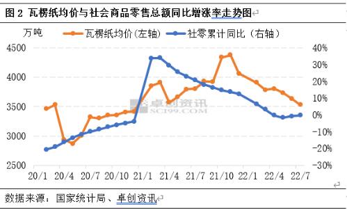 下游需求持續(xù)疲軟 瓦楞及箱板紙終端消費品與經(jīng)濟息息相關(guān),同樣受內(nèi)需不足、出口放緩的影響,需求端整體承壓。圖2數(shù)據(jù)顯示,瓦楞紙與社會商品零售總額同比增長率走勢保持高度相似性,據(jù)國家統(tǒng)計局數(shù)據(jù)顯示,1月份至7月份,社會消費品零售總額246302億元,同比下降0.2%。社會消費品零售總額同比增速不及市場預(yù)期,對包裝紙需求形成一定抑制,瓦楞及箱板紙市場也表現(xiàn)出了“旺季不旺、淡季更淡”的特征。受需求端持續(xù)疲軟影響,市場延續(xù)供大于求格局,導(dǎo)致紙價承壓偏下運行。