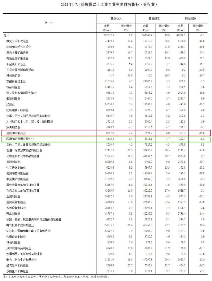 1—7月份,在41個工業(yè)大類行業(yè)中,16個行業(yè)利潤總額同比增長,25個行業(yè)下降。主要行業(yè)利潤情況如下:煤炭開采和洗選業(yè)利潤總額同比增長1.41倍,石油和天然氣開采業(yè)增長1.19倍,電氣機械和器材制造業(yè)增長18.4%,化學原料和化學制品制造業(yè)增長9.3%,有色金屬冶煉和壓延加工業(yè)增長5.1%,專用設備制造業(yè)下降2.6%,農副食品加工業(yè)下降7.5%,非金屬礦物制品業(yè)下降8.2%,計算機、通信和其他電子設備制造業(yè)下降9.6%,紡織業(yè)下降10.3%,電力、熱力生產和供應業(yè)下降12.0%,通用設備制造業(yè)下降12.8%,汽車制造業(yè)下降14.4%,石油、煤炭及其他燃料加工業(yè)下降44.0%,黑色金屬冶煉和壓延加工業(yè)下降80.8%。 值得關注的是,造紙和紙制品業(yè)實現利潤總額287.2億元,同比下降45.6%;印刷和記錄媒介復制業(yè)實現利潤總額202.7億元,同比下降6.2%。
