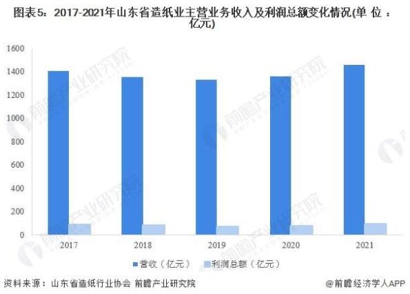 山東造紙業經營效益持續回升 從行業經營效益來看,2017年以來,山東省造紙業主營收入呈現先降后升的趨勢,2021年,全省造紙業實現營收1455億元,同比增長6.98%,創近六年新高。 在利潤總額方面,在經歷2018-2019年的連續下滑之后,2020年,山東省造紙業利潤總額出現強勢反彈,全年實現利潤總額76億元。到2021年,受造紙行業市場供需回暖的影響,全省造紙業利潤總額為91億元,同比增長19.73%。