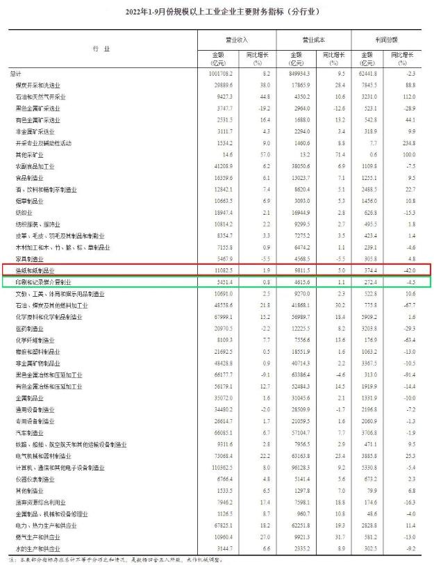 1—9月份,在41個(gè)工業(yè)大類行業(yè)中,19個(gè)行業(yè)利潤總額同比增長,22個(gè)行業(yè)下降。主要行業(yè)利潤情況如下:石油和天然氣開采業(yè)利潤總額同比增長1.12倍,煤炭開采和洗選業(yè)增長88.8%,電氣機(jī)械和器材制造業(yè)增長25.3%,電力、熱力生產(chǎn)和供應(yīng)業(yè)增長11.4%,化學(xué)原料和化學(xué)制品制造業(yè)增長1.6%,專用設(shè)備制造業(yè)下降1.3%,汽車制造業(yè)下降1.9%,計(jì)算機(jī)、通信和其他電子設(shè)備制造業(yè)下降5.4%,通用設(shè)備制造業(yè)下降7.2%,農(nóng)副食品加工業(yè)下降7.5%,非金屬礦物制品業(yè)下降10.5%,有色金屬冶煉和壓延加工業(yè)下降14.4%,紡織業(yè)下降15.3%,石油、煤炭及其他燃料加工業(yè)下降67.7%,黑色金屬冶煉和壓延加工業(yè)下降91.4%。 值得關(guān)注的是,造紙和紙制品業(yè)實(shí)現(xiàn)利潤總額374.4億元,同比下降42.0%;印刷和記錄媒介復(fù)制業(yè)實(shí)現(xiàn)利潤總額272.4億元,同比下降4.5%。