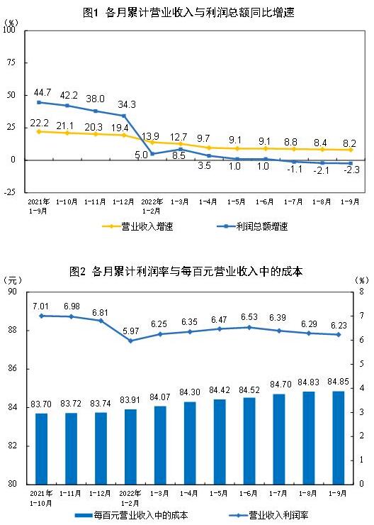 1—9月份,規(guī)模以上工業(yè)企業(yè)實(shí)現(xiàn)營業(yè)收入100.17萬億元,同比增長8.2%;發(fā)生營業(yè)成本84.99萬億元,增長9.5%;營業(yè)收入利潤率為6.23%,同比下降0.67個(gè)百分點(diǎn)。其中,造紙和紙制品業(yè)實(shí)現(xiàn)營業(yè)收入11082.5億元,同比增長1.9%;印刷和記錄媒介復(fù)制業(yè)實(shí)現(xiàn)營業(yè)收入5451.4億元,同比增長0.8%。 9月末,規(guī)模以上工業(yè)企業(yè)資產(chǎn)總計(jì)152.64萬億元,同比增長9.5%;負(fù)債合計(jì)86.71萬億元,增長9.9%;所有者權(quán)益合計(jì)65.93萬億元,增長8.9%;資產(chǎn)負(fù)債率為56.8%,同比上升0.2個(gè)百分點(diǎn)。 9月末,規(guī)模以上工業(yè)企業(yè)應(yīng)收賬款21.24萬億元,同比增長14.0%;產(chǎn)成品存貨5.96萬億元,增長13.8%。 1—9月份,規(guī)模以上工業(yè)企業(yè)每百元營業(yè)收入中的成本為84.85元,同比增加1.06元;每百元營業(yè)收入中的費(fèi)用為7.92元,同比減少0.51元。 9月末,規(guī)模以上工業(yè)企業(yè)每百元資產(chǎn)實(shí)現(xiàn)的營業(yè)收入為90.6元,同比減少1.4元;人均營業(yè)收入為177.9萬元,同比增加15.2萬元;產(chǎn)成品存貨周轉(zhuǎn)天數(shù)為18.0天,同比增加0.9天;應(yīng)收賬款平均回收期為54.0天,同比增加2.9天。 國家統(tǒng)計(jì)局工業(yè)司高級統(tǒng)計(jì)師朱虹解讀工業(yè)企業(yè)利潤數(shù)據(jù)表示,總體看,工業(yè)企業(yè)效益延續(xù)恢復(fù)態(tài)勢,但也要看到,當(dāng)前工業(yè)企業(yè)利潤同比仍在下降,企業(yè)成本水平仍然較高,部分行業(yè)和企業(yè)生產(chǎn)經(jīng)營還存在一定困難,加之國際政治經(jīng)濟(jì)形勢更趨嚴(yán)峻復(fù)雜,工業(yè)企業(yè)效益持續(xù)恢復(fù)面臨風(fēng)險(xiǎn)挑戰(zhàn)。