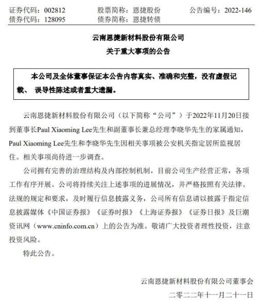 11月22日,恩捷股份開(kāi)盤(pán)跌停,報(bào)價(jià)140.17元/股。 11月21日晚間,恩捷股份發(fā)布公告稱(chēng),公司于11月20日接到董事長(zhǎng)Paul Xiaoming Lee(即李曉明)及副董事長(zhǎng)兼總經(jīng)理李曉華的家屬通知,二人因相關(guān)事項(xiàng)被公安機(jī)關(guān)指定居所監(jiān)視居住,相關(guān)事項(xiàng)尚待進(jìn)一步調(diào)查。 公告還稱(chēng),公司擁有完善的治理結(jié)構(gòu)及內(nèi)部控制機(jī)制,目前公司生產(chǎn)經(jīng)營(yíng)正常,各項(xiàng)工作有序開(kāi)展。