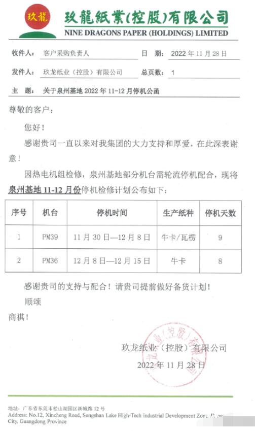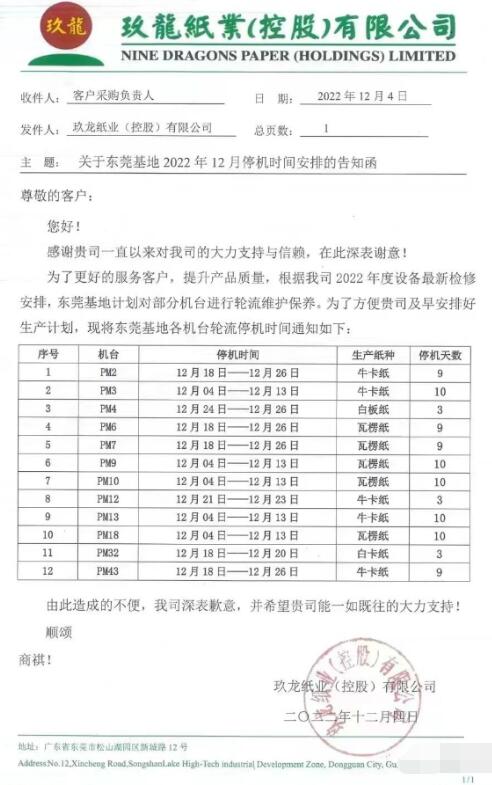 日前,東莞玖龍紙業發布了12月份的停機檢修計劃,12臺紙機將在12月4日-26日輪流停機3-10天,預計減產箱板瓦楞紙和白紙板合計約9.8萬噸。 根據時間段來看東莞玖龍紙業12臺紙機的具體檢修安排: 箱板瓦楞紙機PM3、PM9、PM10、PM13以及PM18已經于12月4日停機,都將在12月13日完成檢修; 從12月18日開始停機的有PM2、PM6、PM7、PM32和PM43。除了PM32將在12月20日完成維護保養外,其余幾臺紙機都將停機至12月26日; 箱板紙機PM12將從12月21日起停機3天,PM4則從12月24日起停機3天。