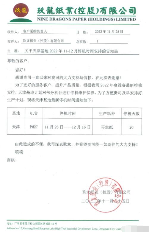 這是玖龍集團近期安排停機檢修的第三個基地。據悉,天津玖龍PM27在11月26日-12月16日期間停機20天;泉州玖龍PM39在11月30日-12月8日期間停機9天,PM36將在12月8日-12月15日期間停機8天。 天津玖龍停機計劃: