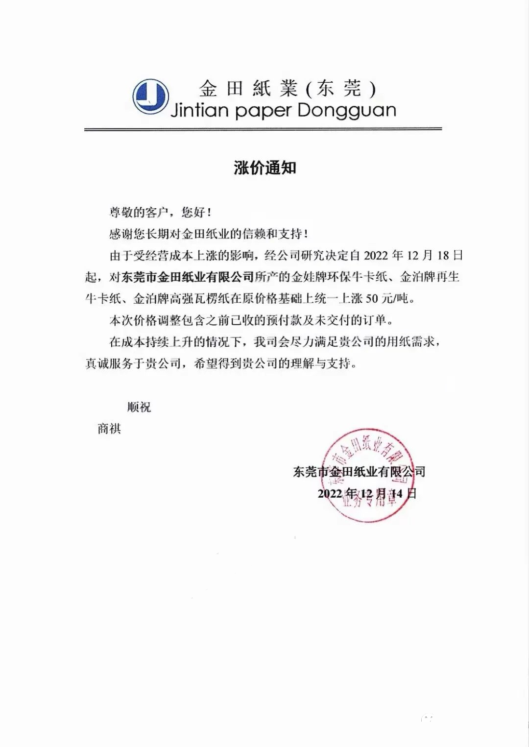 12月14日,東莞市金田紙業發布漲價通知:從12月18日起,對公司所產的金娃牌環保?垺⒔鸩磁圃偕?、金泊牌高強瓦楞紙在原價格基礎上統一上漲50元/噸。本次價格調整包含之前已收的預付款及未交付的訂單。
