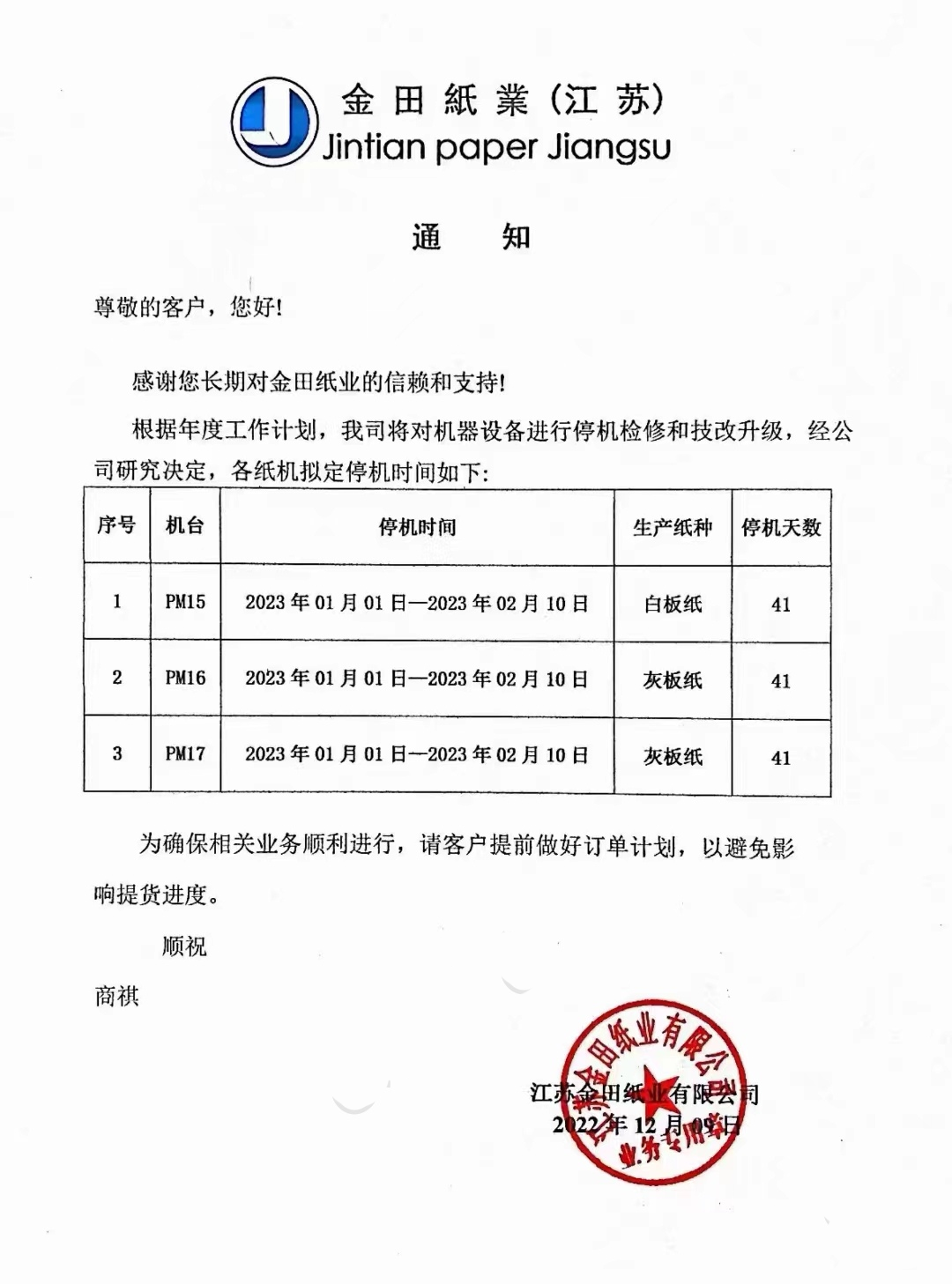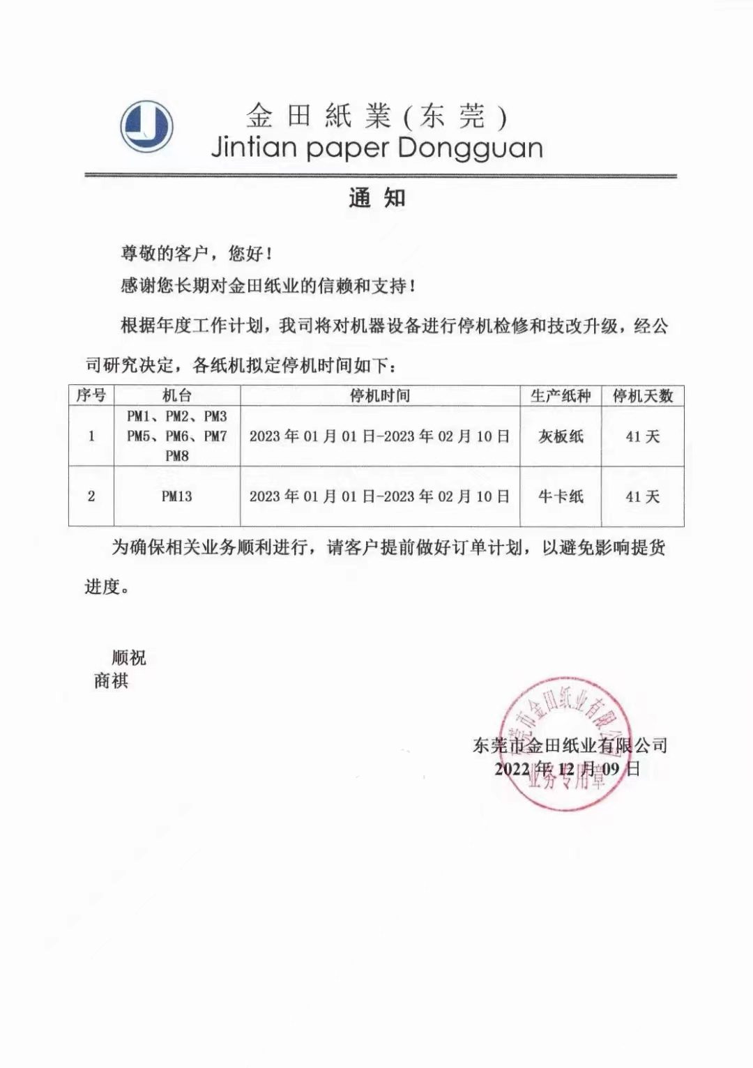 東莞市金田紙業有限公司成立于2003年,是一家現代化工業用紙造紙集團。公司位于東莞市萬江區大汾工業區,現有員工近2000人,主要生產灰板紙、瓦楞紙、紗管紙和涂布白板紙等產品。 此前,東莞市金田紙業還發布了停機通知,其PM1、PM2、PM3、PM5、PM6、PM7、PM8共七臺灰板紙機,以及?垯CPM13均將在2023年1月1日-2023年2月10日停機41天。
