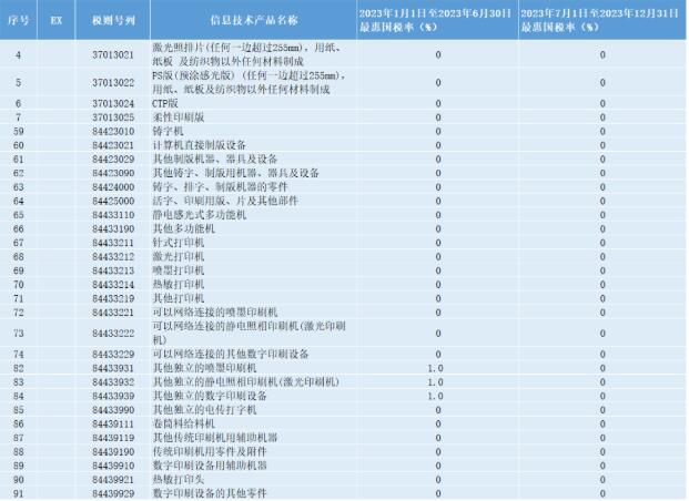 2023年1月,國務(wù)院關(guān)稅稅則委員會(huì)發(fā)布2023年關(guān)稅調(diào)整方案,宣布自2023年1月1日起,對(duì)部分進(jìn)口商品的最惠國稅率、協(xié)定稅率和暫定稅率進(jìn)行調(diào)整。 與2022年相比,2023年有關(guān)印刷設(shè)備器材的進(jìn)口關(guān)稅有所調(diào)整。為方便解讀,下面將分幾個(gè)部分具體分析。 一、《部分信息技術(shù)產(chǎn)品最惠國稅率表》中稅率的調(diào)整 《部分信息技術(shù)產(chǎn)品最惠國稅率表》中共包含了上百款產(chǎn)品。其中,與印刷設(shè)備器材相關(guān)的調(diào)整主要包括印刷版材、印前設(shè)備、數(shù)字印刷設(shè)備,以及印刷零配件和輔助設(shè)備等產(chǎn)品,并且這些產(chǎn)品的關(guān)稅再次調(diào)整(見下表)。