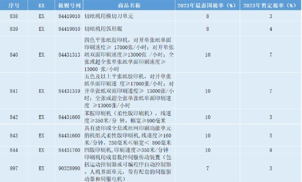 表1 《部分信息技術(shù)產(chǎn)品最惠國稅率表》與印刷設(shè)備器材相關(guān)的調(diào)整 1、印刷版材、印前設(shè)備類產(chǎn)品最惠國關(guān)稅繼續(xù)為零 在2019年7月1日之后,“激光照排片(任何一邊超過255mm),用紙、紙板及紡織物以外任何材料制成”“PS版(預(yù)涂感光版)(任何一邊超過255mm),用紙、紙板及紡織物以外任何材料制成”“CTP版”“柔性印刷版”等印刷版材類產(chǎn)品實(shí)施的最惠國稅率已經(jīng)為零;“鑄字機(jī)”“計(jì)算機(jī)直接制版設(shè)備”“其他制版機(jī)器、器具及設(shè)備”“其他鑄字、制版用機(jī)器、器具及設(shè)備”等印前設(shè)備類產(chǎn)品實(shí)施的最惠國稅率也已經(jīng)為零。2023年全年,以上產(chǎn)品實(shí)施的最惠國稅率依然為零。 2、數(shù)字印刷設(shè)備類產(chǎn)品關(guān)稅進(jìn)一步下降,全產(chǎn)品實(shí)現(xiàn)零關(guān)稅 在2021年7月1日以后,“可以網(wǎng)絡(luò)連接的噴墨印刷機(jī)”“可以網(wǎng)絡(luò)連接的靜電照相印刷機(jī)(激光印刷機(jī))”“可以網(wǎng)絡(luò)連接的其他數(shù)字印刷設(shè)備”等數(shù)字印刷設(shè)備類產(chǎn)品實(shí)施的最惠國稅率均已降為零。2023年全年,以上產(chǎn)品實(shí)施的最惠國稅率依然為零。 在2023年7月1日之前,“其他獨(dú)立的噴墨印刷機(jī)”“其他獨(dú)立的靜電照相印刷機(jī)(激光印刷機(jī))”“其他獨(dú)立的數(shù)字印刷設(shè)備”等數(shù)字印刷設(shè)備類產(chǎn)品實(shí)施的最惠國稅率均為1.0%,但在2023年7月1日以后,三類產(chǎn)品的關(guān)稅將降為零。至此,數(shù)字印刷設(shè)備類產(chǎn)品全部實(shí)現(xiàn)零關(guān)稅。 3、印刷設(shè)備零配件及輔助設(shè)備關(guān)稅維持零關(guān)稅 除印刷版材類產(chǎn)品、印前設(shè)備類產(chǎn)品實(shí)施的最惠國稅率為零,數(shù)字印刷類產(chǎn)品的實(shí)施的最惠國稅率持續(xù)下降外,一些傳統(tǒng)和數(shù)字印刷設(shè)備的零配件、輔助設(shè)備等,繼續(xù)維持零關(guān)稅。 綜上,在《部分信息技術(shù)產(chǎn)品最惠國稅率表》中,截至2023年7月1日前,除“其他獨(dú)立的噴墨印刷機(jī)”“其他獨(dú)立的靜電照相印刷機(jī)(激光印刷機(jī))”“其他獨(dú)立的數(shù)字印刷設(shè)備”等數(shù)字印刷設(shè)備類產(chǎn)品外,其余與印刷設(shè)備與器材相關(guān)的產(chǎn)品在2022年全年維持零關(guān)稅。 自7月1日起,所有與印刷設(shè)備與器材相關(guān)的產(chǎn)品將實(shí)現(xiàn)零關(guān)稅。 二、《進(jìn)口商品暫定稅率表》中印刷相關(guān)產(chǎn)品稅率的調(diào)整 根據(jù)最新發(fā)布的《進(jìn)口商品暫定稅率表》顯示,與印刷設(shè)備及器材相關(guān)的部分產(chǎn)品在2023年1月1日以后,最惠國稅率沒有調(diào)整,保持穩(wěn)定(見下表)。