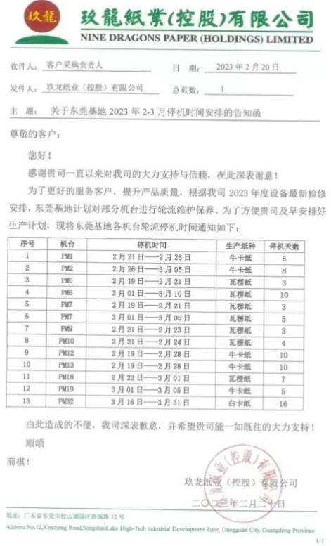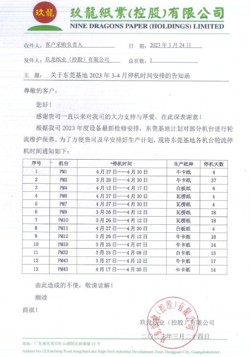 具體而言,東莞玖龍紙業(yè)在3-4月份共有12臺紙機輪流停機4-37天,包括5臺牛卡紙機、2臺白板紙機、4臺瓦楞紙機、1臺白卡紙機。其中,牛卡紙機PM43將分別在3月27日-4月12日、4月17日-4月30日兩個時間段停機。