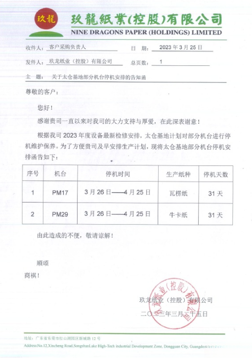 令人意外的是,此前宣布PM8紙機將從3月18日起停機56天的太倉玖龍紙業(yè),本次再度宣布了停機計劃。兩臺紙機PM17、PM29均在3月26日-4月25日期間停機31天,所減產(chǎn)的紙種分別為瓦楞紙、牛卡紙。