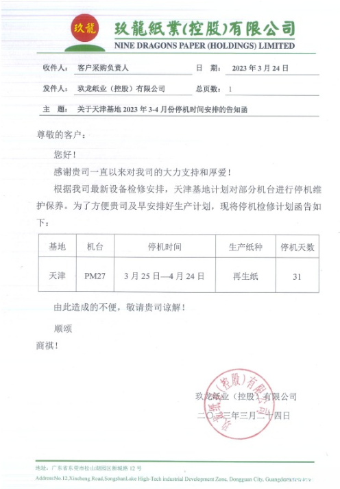 繼續(xù)停機!玖龍紙業(yè)又有多個生產(chǎn)基地宣布停機檢修。3月24日-3月25日,玖龍紙業(yè)東莞、太倉、天津三大基地最新的停機安排發(fā)布,共涉及15臺紙機,涵蓋瓦楞紙、牛卡紙、白卡紙、白板紙。此舉無疑在表明,玖龍紙業(yè)正在加大停機減產(chǎn)力度。