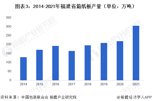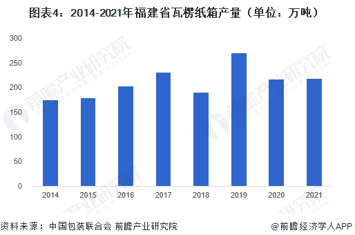 2021年福建省瓦楞紙箱產量為218.67萬噸 瓦楞紙箱方面,根據中國包裝聯合會數據統計,2014年以來,福建省瓦楞紙箱產量呈現波動上升的態勢,2014年福建省瓦楞紙箱產量為175.8噸,到2021年,福建省瓦楞紙箱產量已達218.67萬噸。2020年福建省瓦楞紙箱產量占全國瓦楞紙箱總產量的6.35%,排名第六。