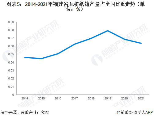 福建省紙制品包裝行業地位分析 根據中國包裝聯合會數據統計,2014-2019年,福建省瓦楞紙箱產量占全國比重整體呈現上升趨勢;2015年,福建省瓦楞紙箱產量占全國比重降至近年最低點,為4.46%,隨后開始持續提升,近兩年來有所回落。2021年,福建省瓦楞紙箱產量占全國比重為6.35%,排名第六。