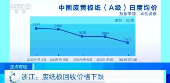 數(shù)據(jù)顯示,截至4月13日,國內(nèi)A級廢黃板紙報價每噸1573元,較去年同期水平每噸2347元,跌幅超30%,是近五年來的最低位。業(yè)內(nèi)人士表示,廢紙板的定價往往取決于下游的造紙廠。在成品紙行情好的時候,廢紙回收價格也會隨之上行;然而去年成品紙的終端需求較弱,導致造紙廠庫存高企,生產(chǎn)需求下降,因此調(diào)低了廢紙的采購價格和回收總量。 上海:造紙企業(yè)加速去庫存 二季度業(yè)績有望迎來修復 記者在采訪中了解到,使用廢紙作為原料的一般是生產(chǎn)箱板瓦楞紙等工業(yè)包裝用紙的企業(yè)。廢紙價格下行很大一部分原因是這類造紙企業(yè)為了調(diào)節(jié)利潤做出的舉措。目前紙企的經(jīng)營情況怎么樣?廢紙價格下跌,對于紙企的盈利能力是否有改善? 在箱板瓦楞紙的生產(chǎn)中,廢紙的成本占比高達70%。業(yè)內(nèi)人士表示,正常來講紙企的凈利潤在每噸300到400元左右,而從去年開始,因為木漿、廢紙等原材料價格大漲和終端需求低迷,紙企已經(jīng)面臨虧損。根據(jù)部分上市公司紙企發(fā)布的業(yè)績預告來看,歸母凈利潤普遍大幅下滑。 上海某紙業(yè)股份有限公司副總裁 嚴大林:成品紙的價格往下跌(每噸)300元左右,之前我可能可以賣大概4500元一噸的價格,現(xiàn)在目前只能4200元以下去賣。為了企業(yè)能夠保證一定的現(xiàn)金利潤,我不得不把廢紙的采購價格壓低。 今年一季度以來,造紙原材料木漿的價格出現(xiàn)松動。4月13日針葉漿報價每噸5953元,相比去年同期每噸7040元,同比下跌15.4%,并且周環(huán)比跌幅仍在擴大。可以看出造紙產(chǎn)業(yè)成本端壓力正在緩解。