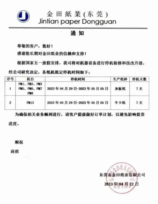 4月22日,東莞金田紙業發布4-5月灰板紙機停機計劃,其中PM1、PM2、PM3、PM5、PM6、PM7、PM8安排停機檢修,停機時間為4月29日-5月5日,共計7天。PM13也同期進行停機檢修,公司牛卡紙產量將受到影響。