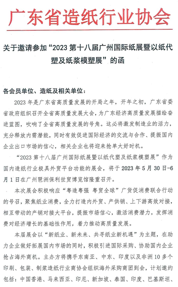 2023第十八屆廣州國際紙展暨以紙代塑及紙漿模塑展(簡稱:第18屆廣州國際紙展),將于2023年5月30日-6月1日在廣州琶洲保利世貿(mào)博覽館隆重召開。