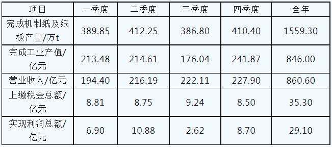 2022年是我國實施“十四五”規劃的第二個年頭,是我國現代化建設進程中的重要一年。這一年召開了中國共產黨第二十次全國代表大會,確立了我國現代化進程和中華民族偉大復興的戰略目標,吹響了奮進新征程的時代號角。 2022年也是極不平凡的一年,面對風高浪急的國際環境和艱巨繁重的國內改革發展穩定任務。以習近平為核心的黨中央團結帶領全國各族人民迎難而上,砥礪前行,統籌國際、國內大局,統籌疫情防控和經濟社會發展,加大宏觀調控力度,應對超預期因素沖擊保持了經濟社會大局的穩定。 過去的一年,疫情散發多發,國際地緣政治波動,全球主要經濟體貨幣政策變化、極端高溫天氣、能源緊缺等多重超預期因素反復沖擊,經濟環境的嚴峻性、復雜性、不確定性上升。 這一年,面對市場低迷、纖維原料短缺、能源原料等主要生產成本攀升給企業生產經營帶來的嚴峻挑戰,浙江省造紙行業深入貫徹新發展理念,堅持穩字當頭,穩中有進,緊扣產業鏈、供應鏈部署創新鏈,推進科技創新支撐行業強勢發展,激活產業發展動能,多措并舉、迎難向上、砥礪前行,確保浙江省造紙產業健康穩定持續發展。 1 浙江省造紙工業2022年概況 據浙江省統計局統計,2022年浙江省造紙行業規模以上造紙企業199家。全年完成機制紙及紙板產量1599.3萬t,同比增長8.0%;實現工業產值846億元,同比下降1.9%;實現營業收入860億元,同比下降2.7%;上繳稅金總額35.3億元,同比增長1.2%;實現利潤總額29億元,同比下降61.6%。全行業應收賬款164.8億元,同比增長17.1%;其中產成品庫存50.5億元,同比增長17.1%。全行業資產合計1209億元,同比增長0.4%;負債合計651.3億元,同比增長1.8%;全行業年平均用工人數41889人。全行業虧損企業數同比增長90.3%,虧損企業虧損額達到13.18億元,同比增長654.9%。 2022年浙江省造紙行業人均生產機制紙及紙板381.81 t。全員勞動生產率(按產值計算)201.96萬元/人,人均稅收8.427萬元,人均創利6.9469萬元。 1.1 2022年浙江省造紙行業各季度運行情況 2022年浙江省造紙行業各季度運行情況見表1。 表1 2022年浙江省造紙行業各季度運行情況