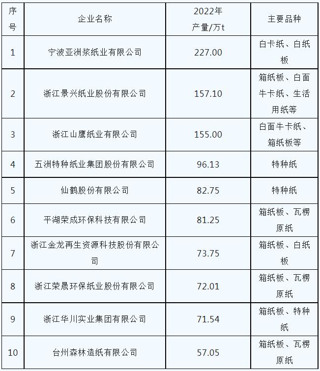2.2機制紙及紙板年產量前十位企業 2022年浙江省機制紙及紙板產量居前十位的造紙企業見表 3, 10家企業合計完成機制紙及紙板產值1073.58萬t,占全省行業完成產量的67.13%。 表3 2022 年浙江省機制紙及紙板產量居前十位的造紙企業