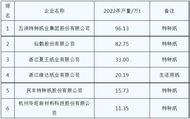 2.3 年產量在 10 萬 t 以上的特種紙及生活用紙企業 2022年浙江省產量在10萬t以上特種紙及生活用紙企業排名見表4。 表4 2021年浙江省產量在 10 萬 t 以上的特種紙及生活用紙企業