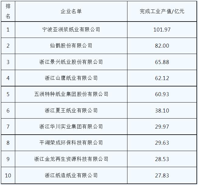 2.4 完成工業產值前10位的造紙企業 2022年浙江省完成工業產值居前十位的造紙企業見表5,這10家企業合計完成工業產值526.96億元,占全省行業完成工業總產量的62.23%。 表5 2022年浙江省完成工業產值居前十位的造紙企業