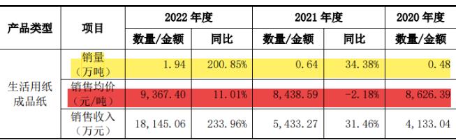近年來,鳳生股份大力拓展了生活用紙成品紙的銷售渠道,通過提高生活用紙成品紙的市場占有率以提升其行業(yè)影響力和綜合競爭力。 2020年-2022年,鳳生股份生活用紙成品紙的銷量分別為4800噸、6400噸、1.94萬噸,銷售均價分別為8,626.39萬元、8,438.59萬元、9,367.40萬元。可以看到,2022年,鳳生股份生活用紙成品紙的銷量增長了2倍有余,銷售均價也同比增長了11%。