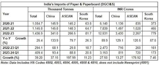 根據印度商業情報與統計總局(DGCI&S)發布的最新數據,印度2024財年第1季度紙和紙板進口量增長39%,達到40.9萬噸,超過23財年第1季度的29.4萬噸。整個2023財年的紙和紙板進口量比2022財年增加了25%。 從價值來看,本季度進口額增長了近28%,達到315.3億盧比。2023財年,進口紙和紙板價值1253.1億盧比。所有等級紙張的進口都在加速,其中非涂布書寫和印刷紙進口增幅最高,達214%,涂布紙和紙板進口增幅達28%,牛皮紙進口增幅達15%,生活用紙進口增幅達65%。2024財年第一季度,從東盟的進口量增長了198%,來自中國的進口量增長了37%。