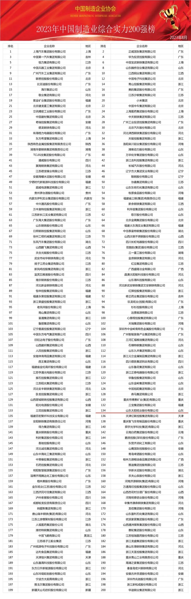近日,2023年中國(guó)制造業(yè)綜合實(shí)力200強(qiáng)暨中國(guó)裝備制造業(yè)100強(qiáng)排行榜發(fā)布,太陽紙業(yè)榮登榜單,位列第134位。
