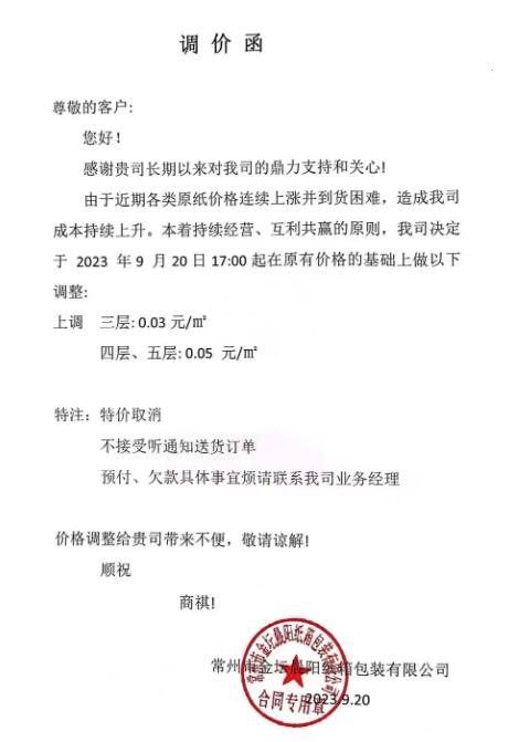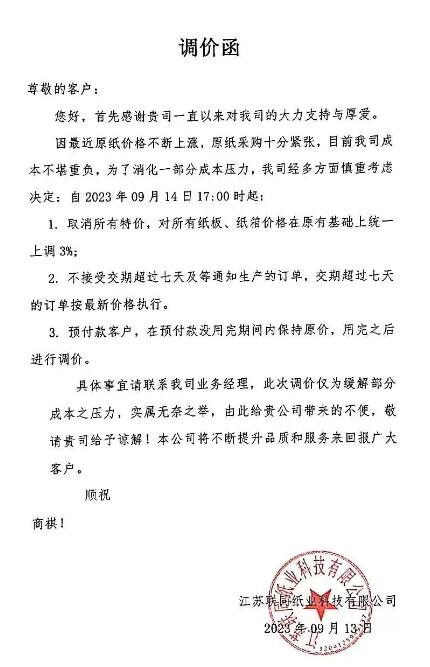 湖北玖龍:9月22日價(jià)格調(diào)整計(jì)劃,再生牛卡上調(diào)100元/噸,地龍及以上?ㄉ险{(diào)50元/噸。