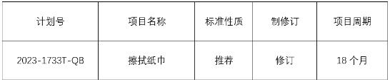 近日,國(guó)家工業(yè)和信息化部辦公廳下達(dá)2023年第三批行業(yè)標(biāo)準(zhǔn)制修訂和外文版項(xiàng)目計(jì)劃的通知(工信廳科函[2023]291號(hào))。其中,《擦拭紙巾》造紙行業(yè)標(biāo)準(zhǔn)計(jì)劃項(xiàng)目獲批立項(xiàng),具體如下所示。