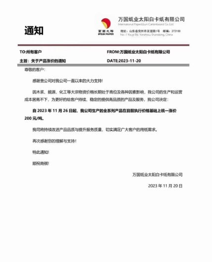 萬國紙業太陽白卡紙有限公司:自2023年11月26日起,我公司生產的全系列產品在目前執行價格基礎上統一漲價200元/噸
