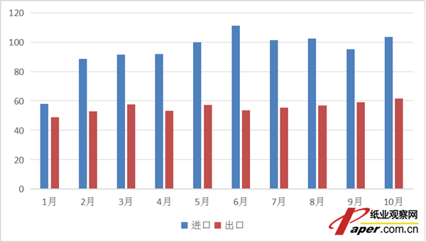 其中,10月份,我國(guó)機(jī)制紙及紙板當(dāng)月進(jìn)口量為103.48萬(wàn)噸,與去年同期的71.07萬(wàn)噸相比,增長(zhǎng)45.61%。當(dāng)月出口量為61.62萬(wàn)噸,與去年同期的50.24萬(wàn)噸相比,增長(zhǎng)了22.66%。