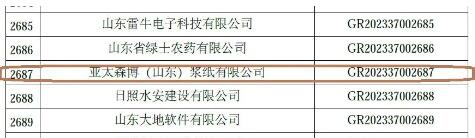 近日,全國高新技術企業認定管理工作領導小組辦公室發布了山東省2023年認定報備的第一批高新技術企業備案名單,亞太森博(山東)漿紙有限公司順利通過認定復審,再獲“高新技術企業”資格。 高新技術企業認定是在國家重點支持的高新技術領域中,對企業核心自主知識產權、科技成果轉化能力、研究開發組織管理水平、企業成長指標等綜合能力進行全方位嚴格認定,體現了企業的科技創新能力和技術成果轉化實力。作為國家級資質認定,“高新技術企業”稱號是中國科技企業的最高榮譽之一,也是對企業科研實力的權威認定。