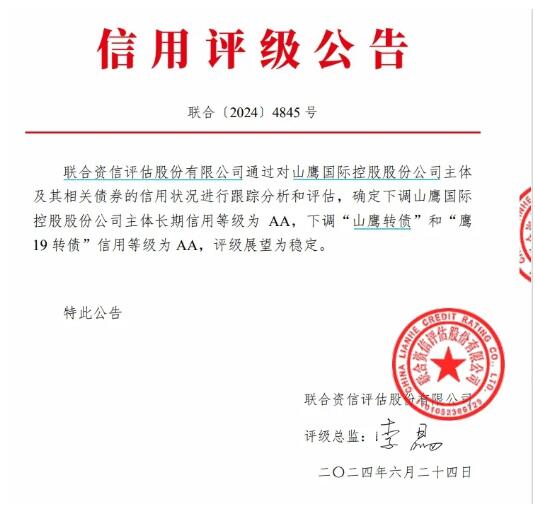 近日,聯(lián)合資信確定下調(diào)山鷹國(guó)際主體長(zhǎng)期信用等級(jí)為AA,下調(diào)“山鷹轉(zhuǎn)債”和“鷹19轉(zhuǎn)債”信用等級(jí)為AA,評(píng)級(jí)展望為穩(wěn)定。