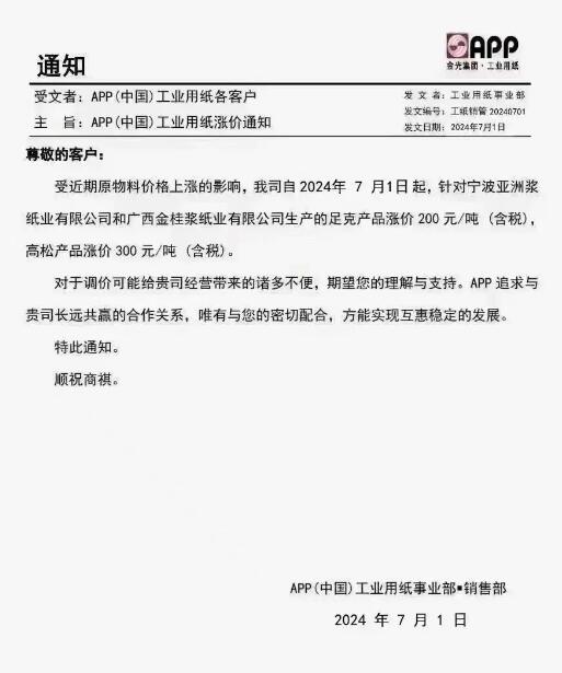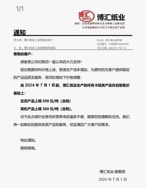 博匯紙業(yè):7月1日起漲價(jià)200-300元/噸。