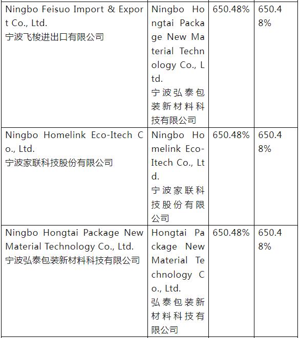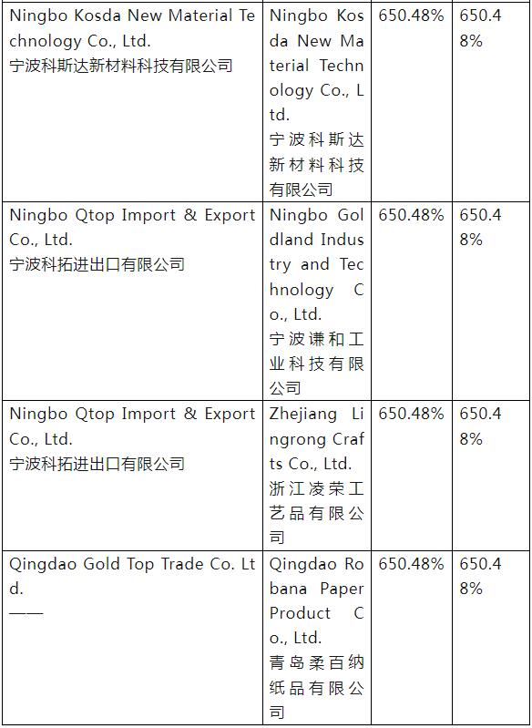 2024年8月30日,美國商務部宣布對進口自中國、泰國和越南的紙盤(Certain Paper Plates)作出反傾銷初裁,初步裁定中國生產商/出口商的傾銷率為0.00%~1039.05%(抵消補貼后的保證金調整為不適用~1039.05%,具體稅率詳見下表)、泰國生產商/出口商的傾銷率為4.23%~73.17%、越南生產商/出口商的傾銷率為0.00%~165.27%(抵消補貼后的保證金調整為0.00%~159.79%)。美國商務部預計將于2025年1月13日對本案作出反傾銷終裁。本案涉及美國海關編碼4823.69.0040項下產品。