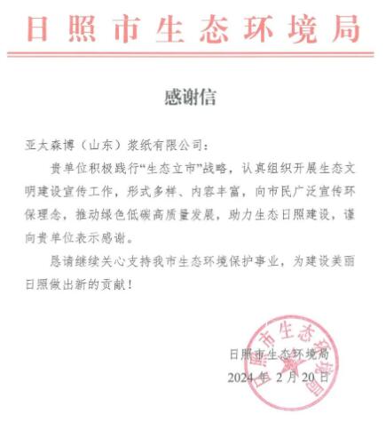 作為一家企業(yè)公民,亞太森博一直致力于綠色高質(zhì)量發(fā)展,累計投入70億元用于環(huán)保,是漿紙行業(yè)產(chǎn)業(yè)升級、技術(shù)進步、綠色發(fā)展的標桿企業(yè),被工信部評為“國家綠色工廠”。在做好自身綠色發(fā)展的同時,亞太森博還積極投身于生態(tài)文明宣教工作,開展了我是小小造紙家、全市少年兒童環(huán)保繪畫大賽、綠色工廠研學、以舊易綠等耳熟能詳?shù)沫h(huán)保公益項目,成為省級環(huán)境教育基地、省十佳環(huán)保設(shè)施開放單位、省科普教育基地等。今年2月份,市生態(tài)環(huán)境局專門向亞太森博發(fā)來感謝信,對公司積極踐行“生態(tài)立市”戰(zhàn)略、認真組織生態(tài)文明建設(shè)宣傳工作、向市民廣泛宣傳環(huán)保理念、推動城市綠色低碳高質(zhì)量發(fā)展、助力生態(tài)日照建設(shè)等方面的貢獻表示感謝。