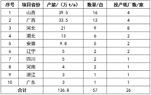 根據生活用紙委員會秘書處調研匯總,2024年1—9月,行業新投產現代化產能約136.8萬t/a,共57臺紙機,包括國產紙機53臺,進口紙機4臺。其中,第一季度投產42.8萬t/a,第二季度投產26.5萬t/a、第三季度投產67.5萬t/a。 第三季度新投產產能比第二季度大幅增加41萬t/a、同比(2023年第三季度投產35.7萬t/a)大幅增加約32萬t/a,使2024年前三季度與2023年同期投產116.7萬t/a相比,增加約20萬t/a。 2024年前三季度新投產產能的地區分布見表1. 表1 2024年前三季度生活用紙行業投產現代化產能地區排序