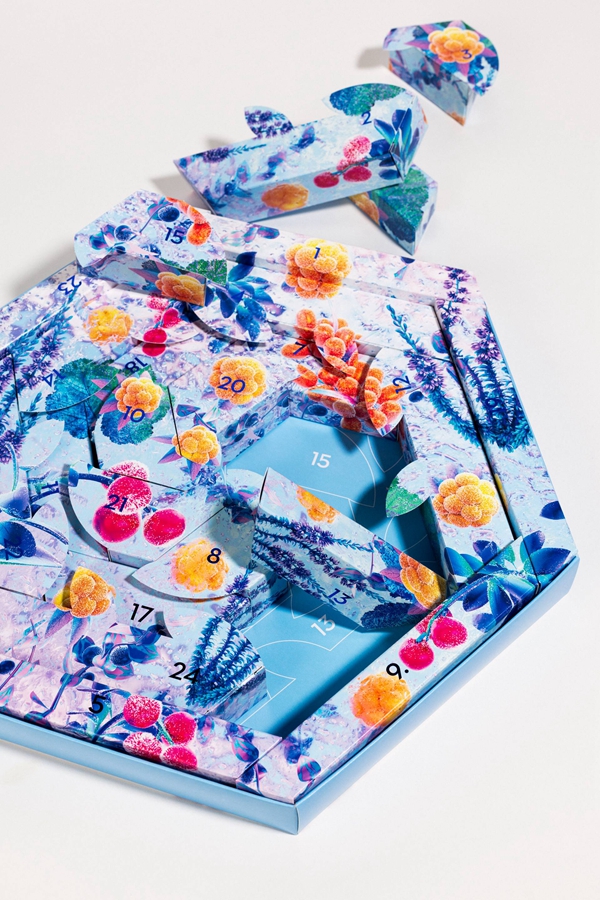 努米寧介紹說:“圣誕日歷禮盒的開口是由不同形狀的盒子拼接而成的,重復拼接后就形成了花朵圖案。這種新穎的結構使內部特別引人注目,而且易于生產! 日歷禮盒包裝由MetsäBoard Prime FBB Bright和MetsäBoard Pro FBB Bright折疊紙板制成,這些紙板產品皆由可再生的新鮮纖維制成,且易于回收利用。這種紙板表面光滑、亮度高,確保了日歷禮盒外包裝和筒套上的冬季景觀美輪美奐。