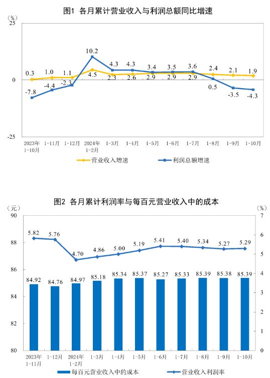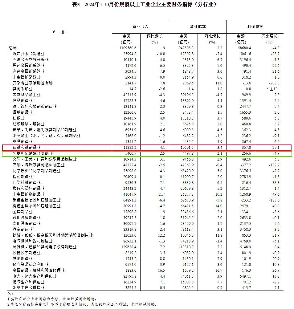 1—10月份,規模以上工業企業實現營業收入110.96萬億元,同比增長1.9%;發生營業成本94.75萬億元,增長2.3%;營業收入利潤率為5.29%,同比下降0.34個百分點。其中,造紙和紙制品業實現營業收入11882.2億元,同比增長4.1%;印刷和記錄媒介復制業實現營業收入5400.7億元,同比增長2.5%。 10月末,規模以上工業企業資產總計176.74萬億元,同比增長4.6%;負債合計102.01萬億元,增長4.5%;所有者權益合計74.73萬億元,增長4.9%;資產負債率為57.7%,同比下降0.1個百分點。 10月末,規模以上工業企業應收賬款26.33萬億元,同比增長7.8%;產成品存貨6.53萬億元,增長3.9%。 1—10月份,規模以上工業企業每百元營業收入中的成本為85.39元,同比增加0.32元;每百元營業收入中的費用為8.42元,同比增加0.06元。 10月末,規模以上工業企業每百元資產實現的營業收入為77.3元,同比減少2.7元;人均營業收入為182.4萬元,同比增加6.6萬元;產成品存貨周轉天數為20.0天,同比增加0.2天;應收賬款平均回收期為66.7天,同比增加3.9天。 10月份,規模以上工業企業利潤同比下降10.0%。 國家統計局工業司統計師于衛寧解讀工業企業利潤數據表示,10月份,隨著存量政策及一攬子增量政策協同發力、持續顯效,規模以上工業企業生產穩定增長,企業利潤當月降幅明顯收窄。多數行業盈利較上月好轉,裝備制造業和高技術制造業等新動能支撐作用較強,原材料制造業和消費品制造業利潤降幅大幅收窄。企業效益狀況呈現以下主要特點:工業企業當月營業收入和利潤降幅收窄。超六成行業盈利較上月好轉,制造業最為明顯。不同類型企業利潤均有回升。裝備制造業利潤由降轉增。原材料制造業和消費品制造業利潤好轉。高技術制造業利潤兩位數增長。總體看,雖然規上工業企業利潤仍處下降區間,但在存量政策加快落實以及一攬子增量政策加力推出帶動下,工業企業效益狀況有所改善。
