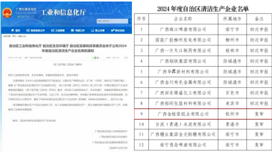 歲末年初,喜報盈門!近日,廣西金桂漿紙業有限公司分別獲得“2024年度自治區清潔生產企業”、“2024年度自治區企業技術中心評價優秀”、“2018-2022年度廣西‘守合同重信用企業’”、“2024年度自治區工業節水標桿企業”4項榮譽,迎來了2025年“開門紅”! 2024年度自治區清潔生產企業 2024年12月30日,廣西壯族自治區工業和信息化廳、生態環境廳、發展和改革委員會公布了2024年度自治區清潔生產企業名單的通知,廣西金桂漿紙業有限公司再度上榜。