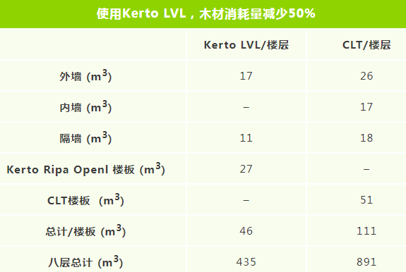 Kerto LVL(單板層積材)作為公寓樓的承重木框架材料,無論是在新建筑、翻新還在現有建筑之上增加樓層時,都是理想的選擇。與傳統木材相比,使用Kerto LVL可以減少高達50%的結構材料需求。 Kerto® LVL不僅是一種優于鋼和混凝土的選擇,也超越了其他基于木材的解決方案。Kerto LVL的強度-重量比接近于鋼,使得在建造承重結構時可以使用更少的材料,從而實現更輕的構件、更低的排放以及更多的居住空間。 例如,在承重外墻構件中,將140毫米厚的CLT(交叉層積材)更換為69毫米厚的Kerto LVL Q面板(具有相同的承重能力),可以減少51%的木材使用量,同時使墻構件的厚度減少71毫米。對于公寓的每15米外墻,可以額外獲得1平方米的可出售或出租的居住面積。 該建筑遵循瑞典規范,設計為8層住宅樓,平面尺寸為20x16米。它滿足消防安全要求,承重墻的防火等級為R90.樓板為R60.建筑確保了聲學舒適性,隔墻根據聲學設計師的建議被分類為聲學等級B。