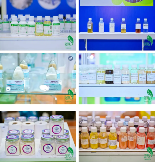 造紙化學(xué)品展區(qū) 展示變性淀粉、施膠劑、水溶性高分子聚合物、功能性及過(guò)程性造紙化學(xué)品、填(顏)料、涂布粘合劑(膠料)、造紙生物酶及生物技術(shù)、造紙用各類(lèi)水處理劑、其它各類(lèi)造紙化學(xué)品等。