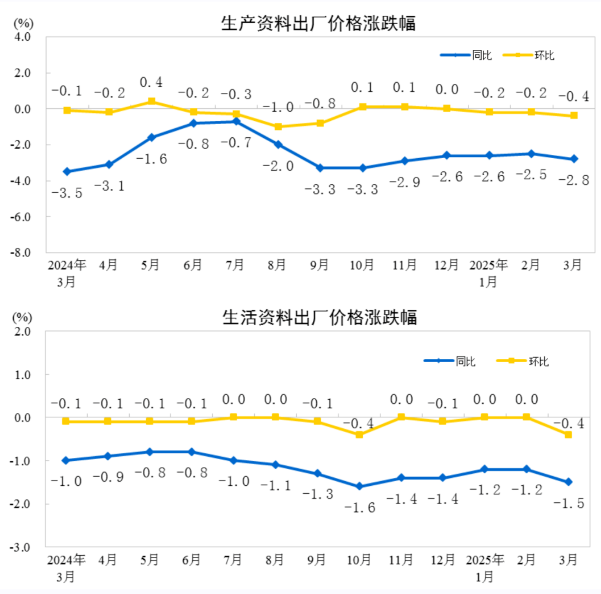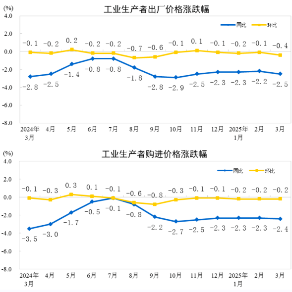 近日,國(guó)家統(tǒng)計(jì)局發(fā)布2025年3月份工業(yè)生產(chǎn)者出廠價(jià)格數(shù)據(jù)情況。2025年3月份,全國(guó)工業(yè)生產(chǎn)者出廠價(jià)格同比下降2.5%,環(huán)比下降0.4%;工業(yè)生產(chǎn)者購(gòu)進(jìn)價(jià)格同比下降2.4%,環(huán)比下降0.2%。 一季度,工業(yè)生產(chǎn)者出廠價(jià)格和購(gòu)進(jìn)價(jià)格比上年同期均下降2.3%。